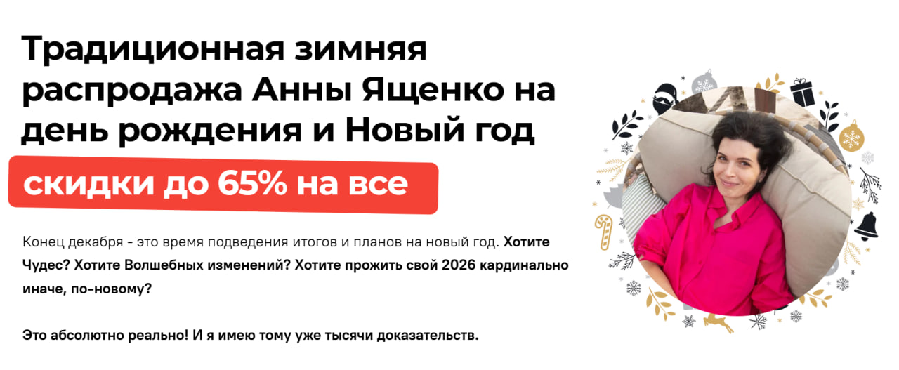 Все-все про системы, теплые отношения в контакте, управление собой, давление, антипрокрастинацию и многое другое, все тут со скидками до 65% на моей распродаже в честь Дня рождения и Нового года. ВАШ ВЫХОД НА НОВЫЙ УРОВЕНЬ ЖИЗНИ (не важно, есть у вас дети или нет).
