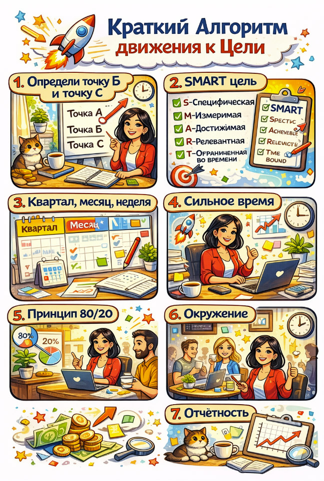 1. Реши, чего точно хочешь, какая у тебя точка Б (об этом еще будут уроки), и желательно, сразу придумай точку С (за точкой Б). Желательно, чтобы это была цель-паровоз.