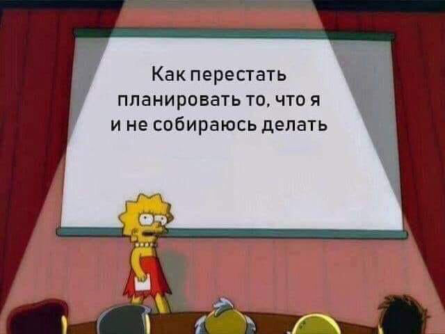 Еще у многих такой образ мыслей, что они — для планов. А не планы для них. Вместо удобной работы с планом, как с инструментом под себя, они ощущают себя рабами планов, ответственны перед планами за выполнение, прячутся от своих планов, как от начальников, злятся или стесняются, чувствуют вину, расстраиваются и все на свете. У многих невротизм и давление от планов. Потому что планы чрезмерны и неудобны, и в неудобное время делаются.